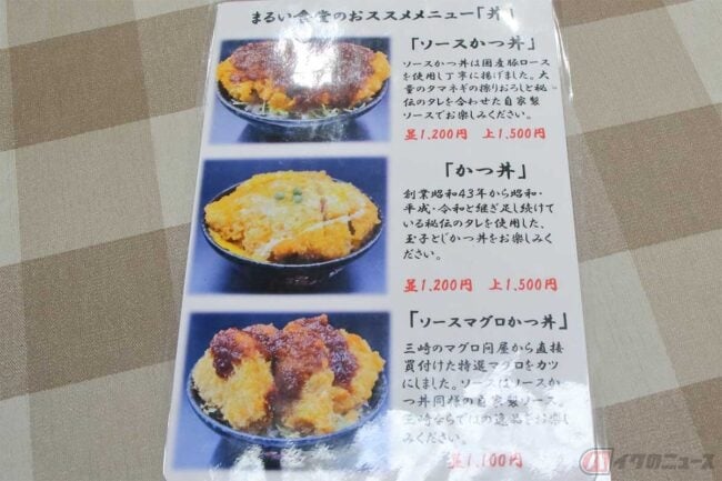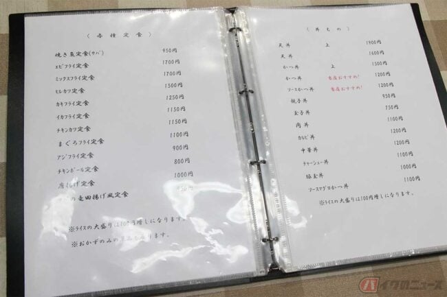 迫力いっぱいのビジュアルが欲しくてZさんに勧めるものの「俺は少食だから」「胃が悪いから」と、頑なに拒否します。筆者は「アジフライ定食」一択なので安全です。結局、人気メニューの「かつ丼・上」(1500円)と「アジフライ定食」(900円)をお願いしました。