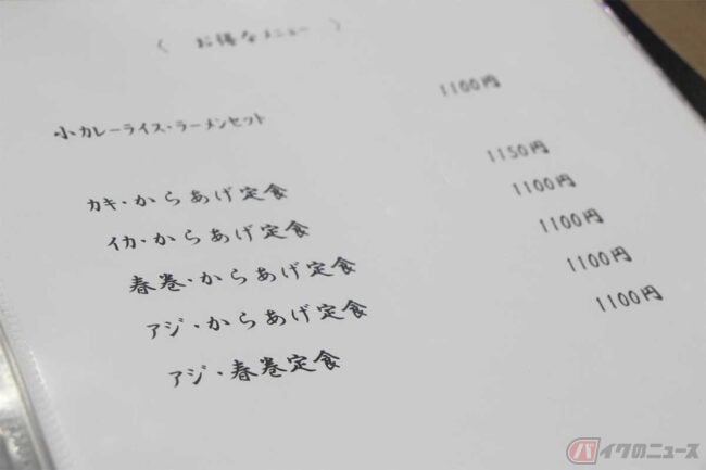 オーダーした後にメニューを見ていると、別ページの「お得なメニュー」に「アジ・からあげ定食」と「アジ・春巻定食」があるではないですか(各1100円)! 少しだけ動揺する筆者でした。