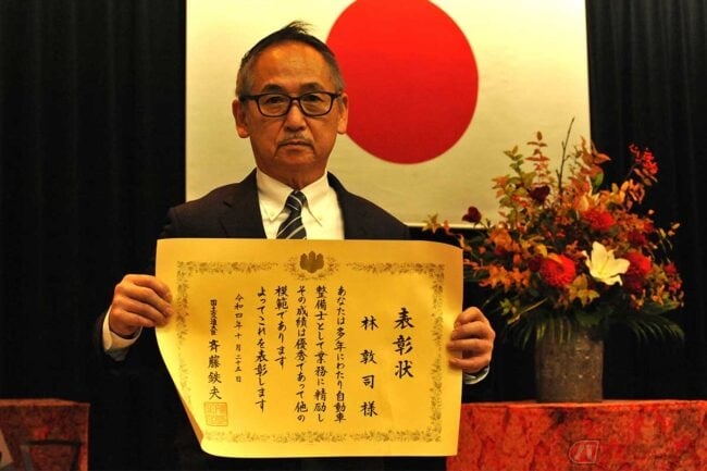 永年表彰を受けるためには、30年以上整備士を続けていることが大前提です。そのほかにもいくつかの条件があり、そのため表彰者の年齢構成は高くなるのですが、その中でも林代表は一番若手です。