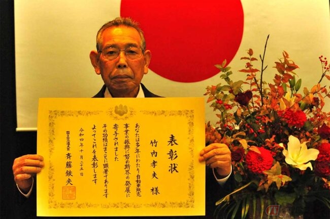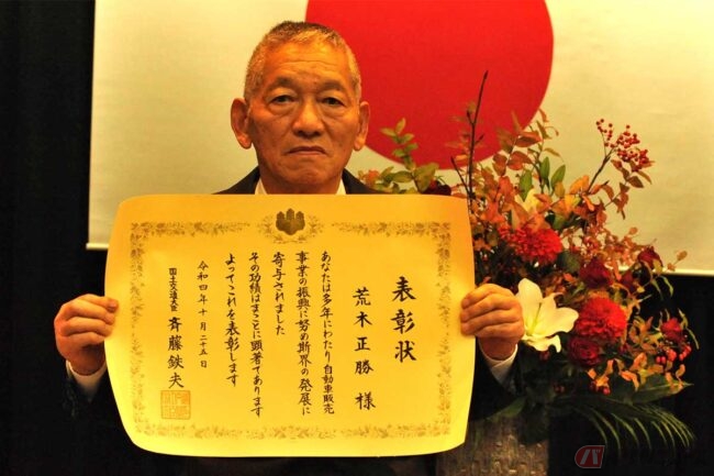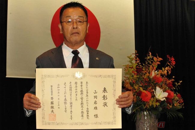 大阪市旭区の「共栄モータース」の山岡岩雄社長(72)は、ショップ経営と共に、大阪オートバイ事業協同組合が主催するバイク・オークションの委員長を29年間務めた業績が評価されました。