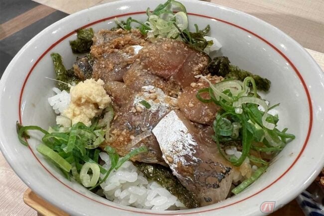 「DX」メニューにかなり心惹かれましたが、まだ300km走るのに揚げ物三昧は辛い……と、見つけたのが「あじあじセット」(1200円)です。長崎や天然などといった冠はありませんが、アジフライ(1枚)とアジ丼がセットで良い感じ、コレに決まりです。