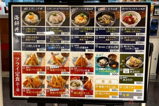 話は戻って、フードコートに入ると空腹には堪らないお店が何軒もあって悩みます。名古屋コーチンの親子丼に八丁味噌ラーメン、名古屋名物の味噌カツと、悩みつつ歩いて行くと一番奥に「漁師食堂 三河丸」という海鮮系の店がありました。しかも「絶品アジフライ」と書いたノボリが立っています!