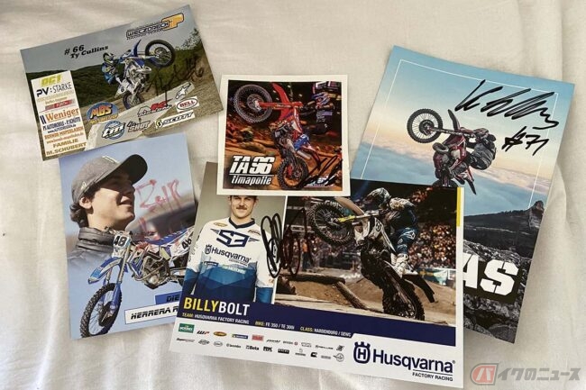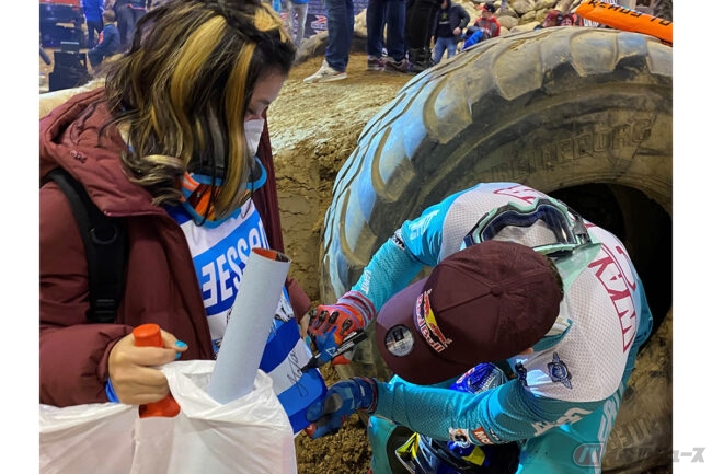 たまたまレース後に会えたので、もらった参加賞にサインもらっちゃいました。パドックで見かけた時に膝が痛そうだったので聞いたところ、あまりコンディションは良くないけど頑張る! とのことでした。 同じくAMA全米選手権エンデューロクロスに参戦中しており現在ポイントランキング3位です。
