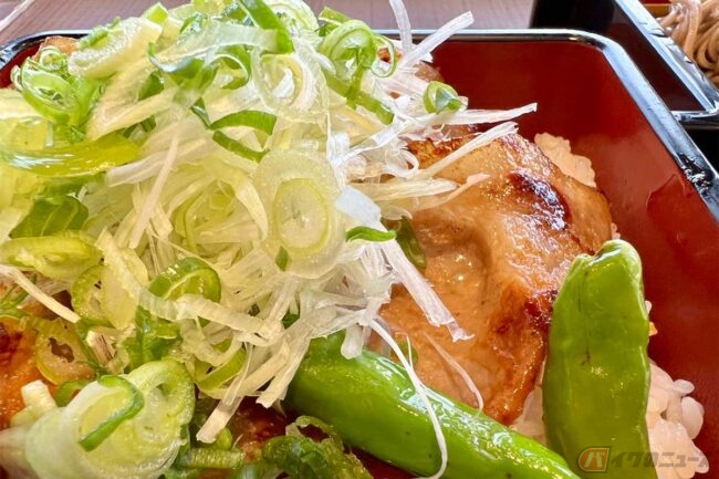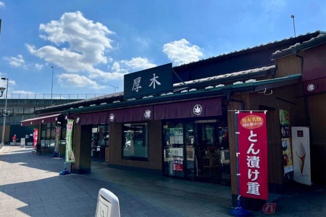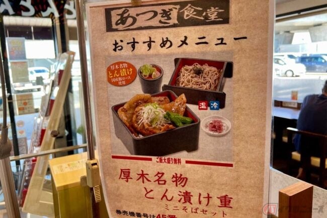 圏央道「厚木PA」(外回り)のフードコートには、和風テイストの建物のイメージにぴったりな、和食中心のメニューが充実しています。ちょっと贅沢な「厚木名物 とん漬け重 ミニそばセット」をいただきました。