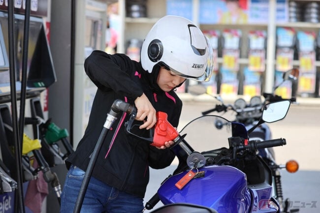 バイクは構造上、停車の際に左側に重心が傾くようになっています。その際に給油口およびタンクも左へ傾くため、給油レーンに対して右側にバイクを停車させられるようにすると、タンク内のガソリン残量を確認しやすく、ノズルも給油口にさし込みやすくなります。このように、ガソリンスタンドが空いている場合は、給油レーンの右側にバイクを停められるようにするのが良いでしょう。