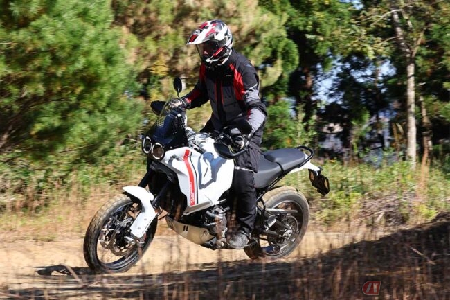 21インチサイズのフロントタイヤを履き、サスペンションストロークが長いため、ホイールベースが長いデザードXながら、前後タイヤへの荷重分布も適切で、アクセルコントロールによるダートバイクらしい走りも決めやすいことに嬉しくなりました。