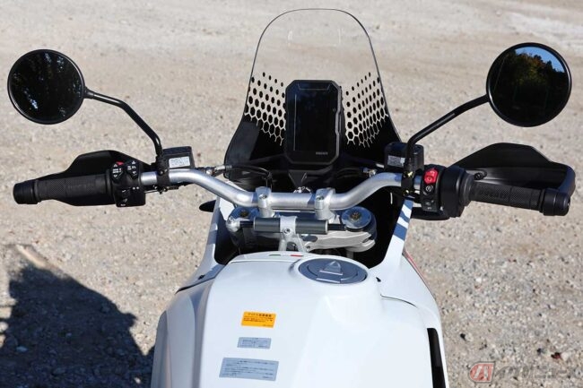 ライトマスクと一体になったスクリーンの性能も高く、高速道路移動の快適性も充分。また、ワインディングでの走りもさすがドゥカティ。フロントはブレンボ製4ピストンモノブロックキャリパーをダブルディスクと組み合わせ、リアの2ピストンフローティングキャリパーによる操作性の良さ、ブレーキ性能や減速時の姿勢変化も含め、ビシっと筋の通った走りを楽しめました。ブロックパターンのタイヤですが、舗装路でのグリップに死角ナシ、という印象です。