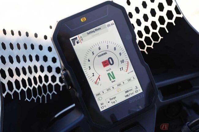 それでいて、古さ推しだけではありません。メインスイッチを入れ、5インチのカラーTFTモニターを経由して設定画面へと入り込めば、そこはドゥカティ最新モデルと同様なビジュアルで、解りやすくアクセスできる世界がしっかりと構築されています。