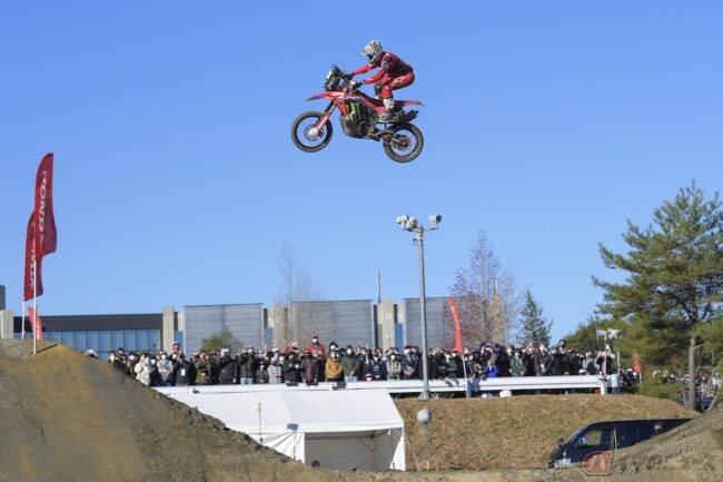 特設モトクロスコースでは、ホンダに1989年以来初のダカールラリー優勝をもたらしたリッキー・ブラベック選手が世界ラリーレイド選手権マシンCRF450Rallyでジャンプもしてしまうし、モトクロス世界選手権チャンピオンのティム・ガイザー選手はCRF450RWでビッグジャンプをワンハンドでキメて、もうスゴイとしか言いようがありません。