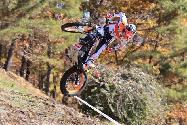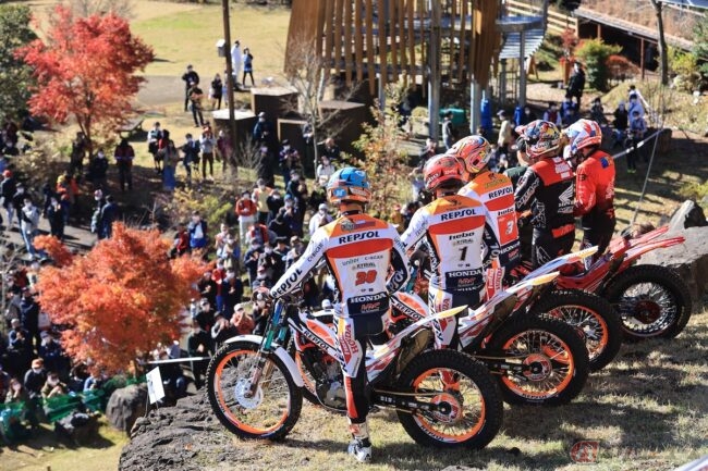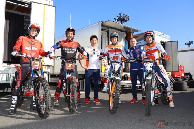1999年から26年もの長い間、ホンダとともにたたかったトライアルライダーの藤波貴久選手は今季から監督としてRepsol Honda Teamを牽引した。走る勇姿を観ておきたいと今度は特設トライアルコースへ移動すると、世界選手権とXトライアルでそれぞれ16連覇中のトニー・ボウ選手ら豪華メンバーでトリックを次々に繰り出し、度肝を抜かれます。