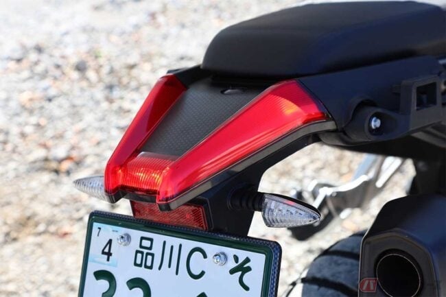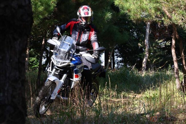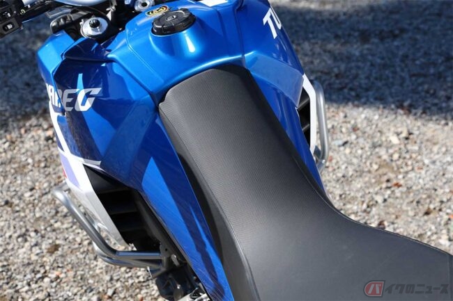 跨がってみると、燃料タンクにつながるシート前端部はしっかりとシェイプされ、860mmのシート高から想像するより足つき性の安心感は高いものでした。前後240mmという長めのサスペンションストロークを持ちながら、ライダーが跨がった時点で比較的ソフトに沈む設定も手伝っていると思います。ちなみに筆者(松井勉)の体重は84kgなので、この体感も個人差があるとは思います。
