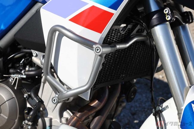 最初に見た時、そのサイズ感がボリュームたっぷりであることに驚きました。ホンダ「CRF1100Lアフリカツイン」と並べても大差ないのでは、と思ったほど。調べてみると、実際にはそこまでの大きさはないものの「立派」さも魅力のひとつであるこのカテゴリーのバイクにとっては大切なセールスポイント。