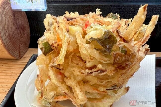 こちらでは数種類の鰹を使用した出汁も自慢のようです。メニューに「おすすめ」とあった「自家製粉手打ちかき揚げ付うどん」(750円)を大盛り(プラス100円)でオーダーしました。