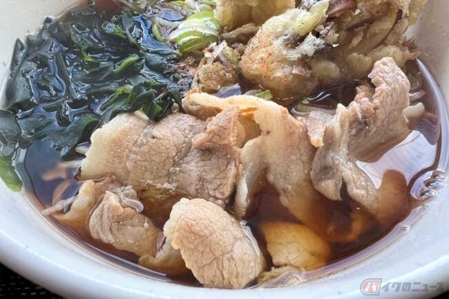 東名高速道路「中井PA」(下り)は、24時間営業のフードコートもあり、「鮎沢PA」同様トラックドライバーの利用も多く見られます。ここの定番メニューと言えば「豚肉そばセット」(790円)です。関東風鰹出汁の濃い色のそばつゆに、豚肉の旨味が溶け出して飽きの来ない味、それに高菜ごはんがセットになっています。