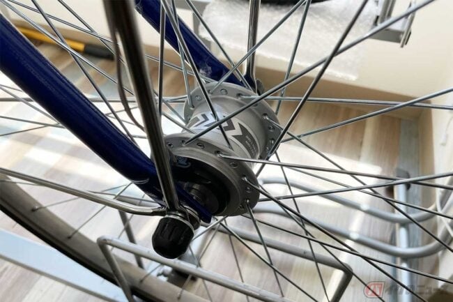 「ハブダイナモライト」は、前輪の中心部にあるハブ軸にダイナモ(発電機)が組み込まれたタイプです。外観では通常の前輪に比べてハブ軸がかなり太くなっているので、簡単に見分けることができます。