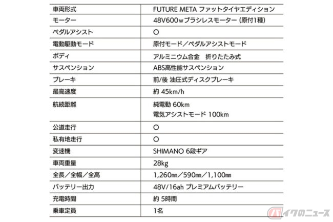 満充電まで約5時間、シマノ製6段変速ギアも備えたFUTURE METAの価格(消費税10%込)は18万3650円から(販売台数により変動/一般販売予定価格は34万9800円)となっています。
