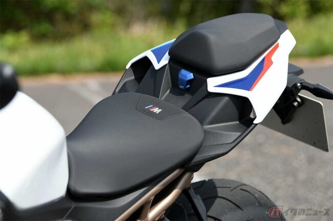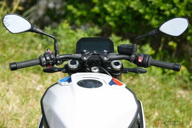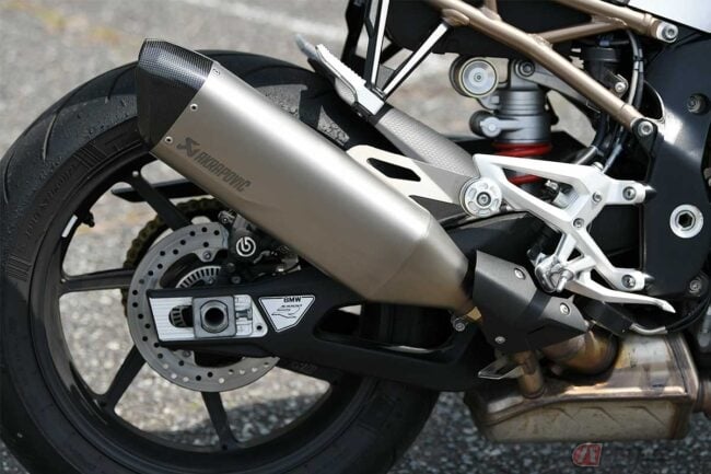 試乗したのは最上級グレードの「Mパッケージ」です。アクラポヴィッチ製のスポーツサイレンサーを標準装備しているので、すぐにそれとわかります。軽量化はもちろん、バンク角を稼ぐトライオーバル形状も戦闘力の高さが一目瞭然です。