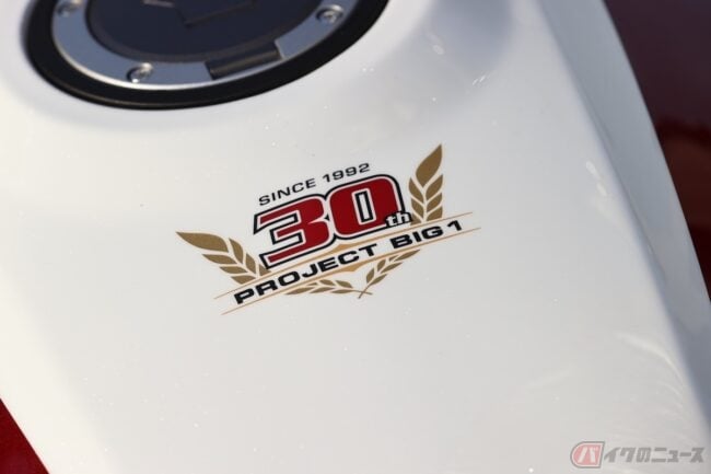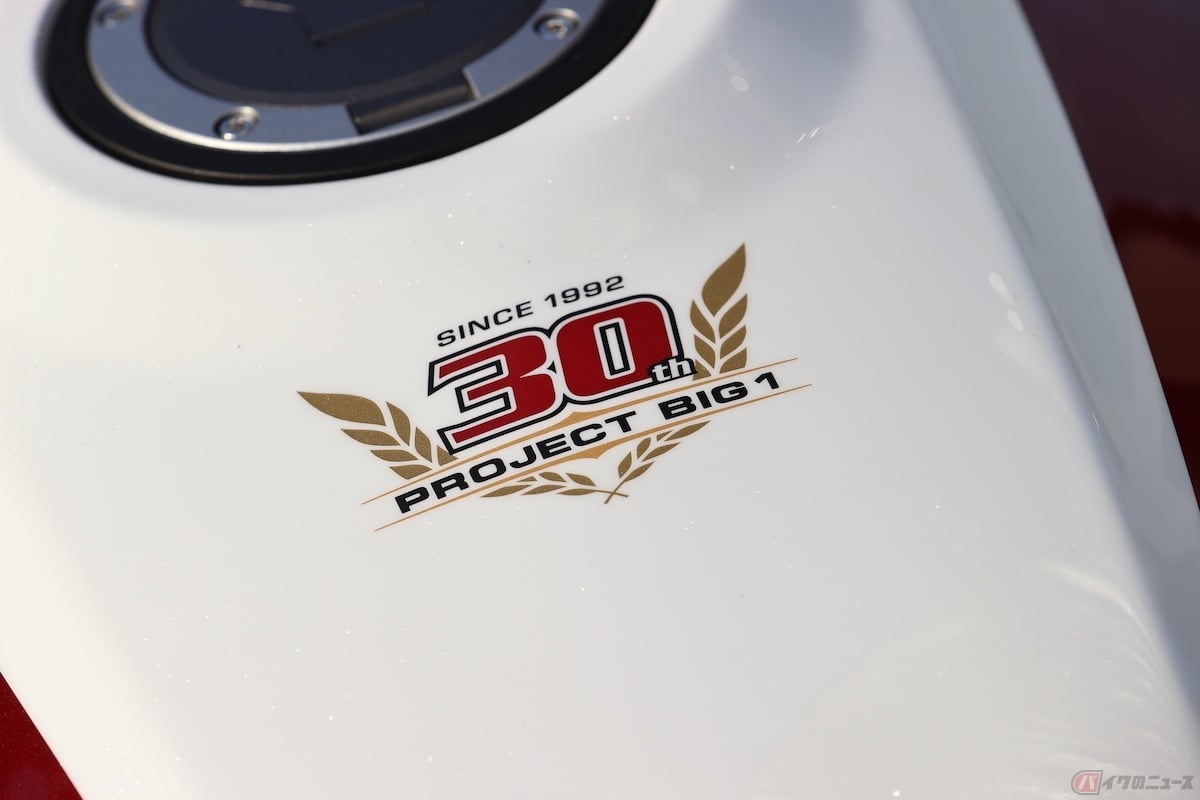 30周年記念車では初代イメージのホワイト×レッドの車体カラーにゴールドのラインを施し、フューエルタンク上部には記念マークも入りました。
