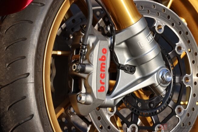 両モデルとも前後サスペンションをオーリンズ製にし、ゴールドに輝くインナーチューブ径43mmのフロントフォークや大容量リザーバータンクを備えるツインショックにグレードアップした「SP」がベース。フロントブレーキにはブレンボ製モノブロック対向4ポットラジアルマウントキャリパーを装備しています。