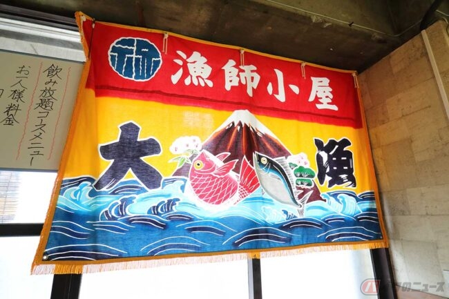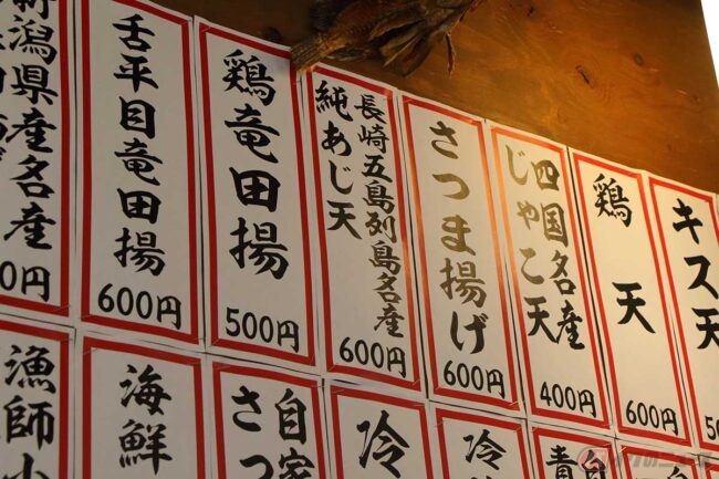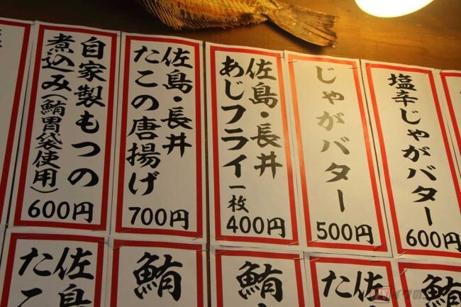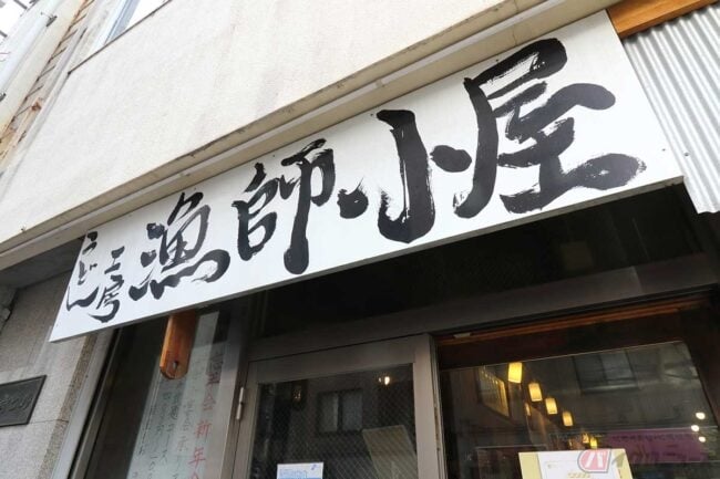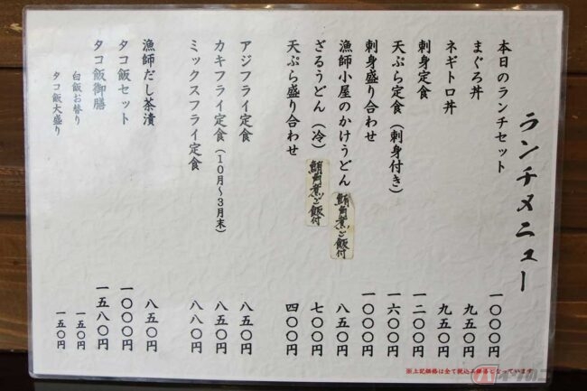 ランチメニューでは刺身定食にアジフライや季節限定のカキフライ定食など、美味しそうなメニューが並んでいます。その中に「うどん」もあるのが不思議ですが、以前は「うどん屋」だったそうです。そう言えば店の看板には「うどん工房 漁師小屋」とあります。