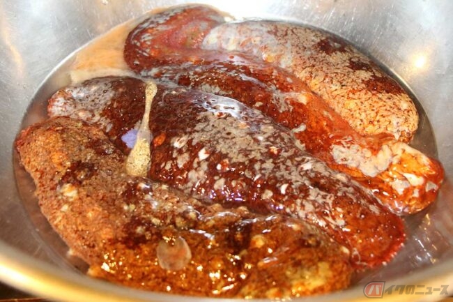 ご主人が魚を捌いているので見せてもらうと、カサゴやカワハギなど、酒を呑みたくなるような魚が多いです。新鮮なナマコも美味しそうです。ふと見ると、黄色い横縞の入った魚がいるではないですか。相模湾や伊豆でダイビングをするとよく見る「たかのは鯛」です。食べる魚だとは思ってなかったのでびっくりです。