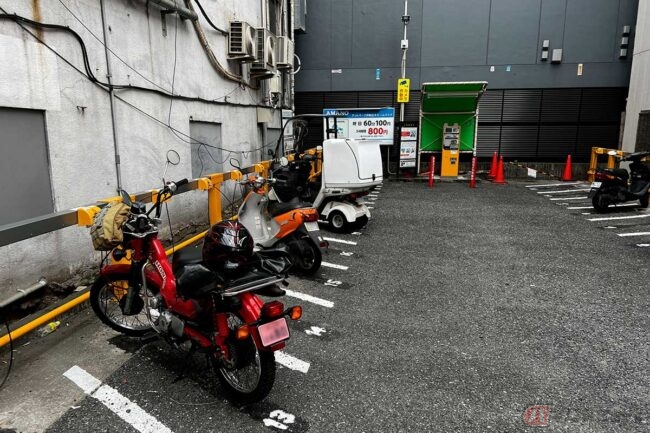 美味しいアジフライを求めて、筆者(増井貴光)がホンダ「CT110」でやってきたのは神奈川県横浜市です。まずは横浜スタジアムに近い関内のショップへ、修理に出していたブーツを受け取りに来ました。東京都内だとバイクを停める場所が無くて困ることもありますが、横浜市の中心部はバイク駐車場が多いので、安心してバイクで来ることができます。