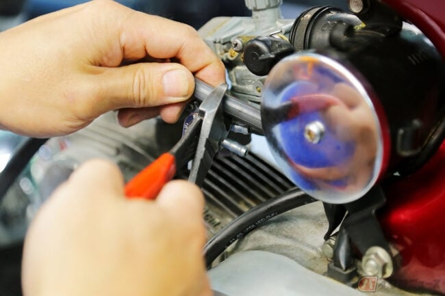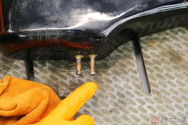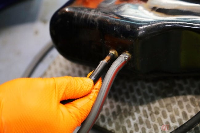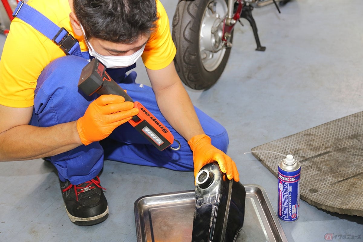 ガソリンタンクの中にサビは見られませんでしたが、劣化したガソリンがこびりついていたため、今回の取材日までに細井さん(ナインゲート店主)がエンジンコンディショナーで洗浄してくれていました。