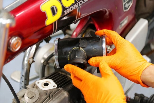 エアクリーナーの吸気吸入口はフレーム内に入れるので、キャブレター装着前に必ずエアクリーナーボックスを装着します。
