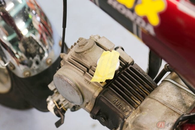 キックスタートでエンジン始動。再取付けしたキャブレターも問題なくアイドリンは安定し、吹け上がりも良好。