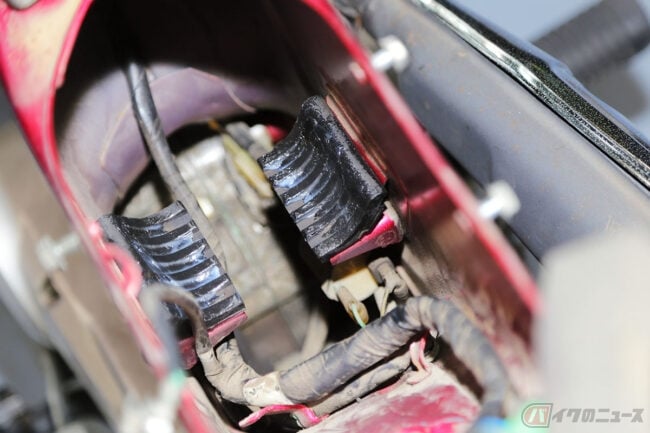 タンクの装着はフレーム内に滑り込ませるようにして入れ込みます。これがじつに大変なので、滑りやすいようにラバーグリスをマウンティングラバーに塗り込みます。