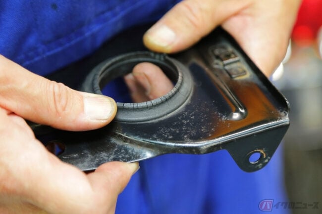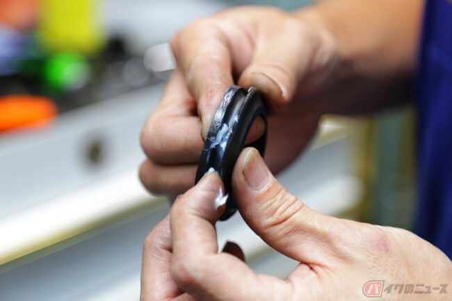 ガスケットの溝部分(ブラケットとの装着部)にラバーグリスを塗ります。「ゴムパーツは油分を与えることで、持ちが良くなります」と細井さん。