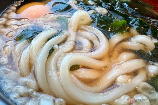 出来上がってきたうどんは、わかめ、刻みねぎ、天かすが乗り、生卵が投入されたシンプルなもの。月見うどんについては、卵の黄身を満月に見立てたものですが、たまに温泉玉子で白身を雲に見立てたものも見かけます。