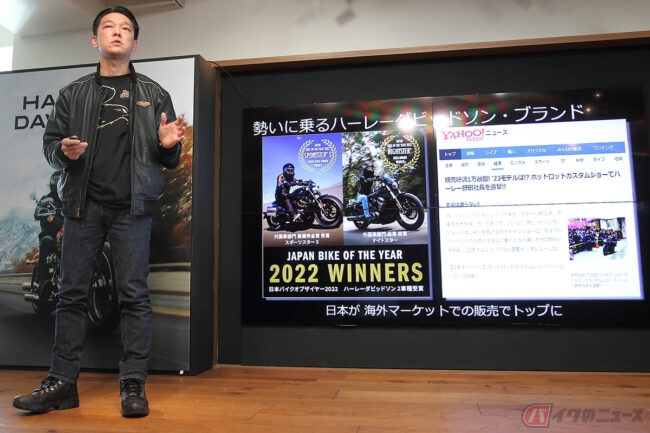 実際、この日のダビッドソン・ジャパン(以下:HDJ)の野田代表の言葉によるとハーレージャパンの2022年度は「絶好調」だったとのことで『バイク・オブ・ザ・イヤー』では“スポーツスターS”と“ナイトスター”の2モデルが選出。また登録台数も1万200台を数えたのですが、これは前年比35%アップとのこと。北米以外の世界市場でも日本が最も大きなマーケットだといいます。