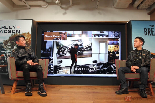 今回は、その日本の中で高い人気を誇る“ブレイクアウト”の日本モデル・ジャパンプレミアが開催されたのですが、ゲストとなった魔娑斗氏の来場はYou Tubeがキッカケだったとのこと。1年ほど前、魔娑斗氏のチャンネルでハーレーを購入すべくディーラーを来訪する回が配信されたのですが、その中でひと目ボレしたモデルがまさに“ブレイクアウト”。加えてHDJ代表の野田氏が、そもそも格闘技ファンだったことも今回のゲスト出演につながったそうです。