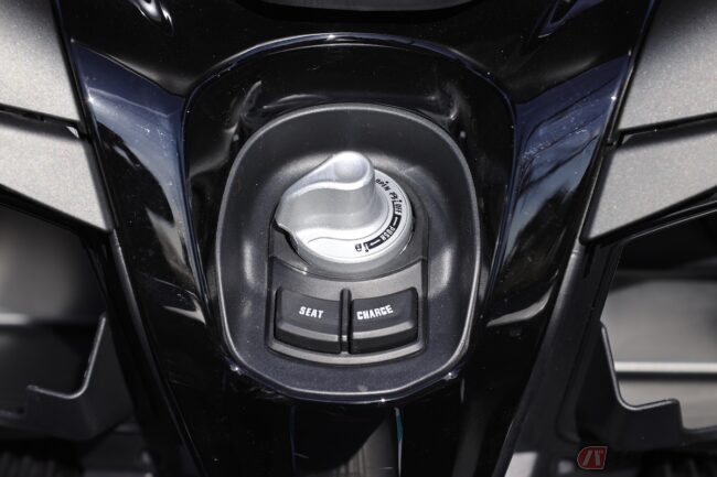 ハンドルの下部分を見ると、シートを開けるスイッチ「SEAT(シート)」の隣に「CHARGE(チャージ)」と書かれたスイッチが並んでいます。以前、試乗したヤマハの『NMAX』は「FUEL」のスイッチでした。