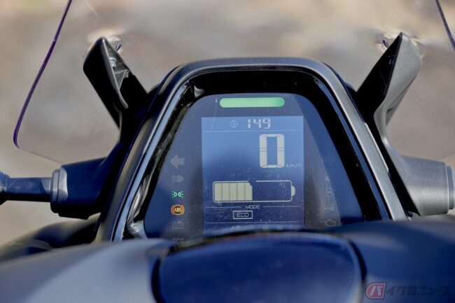 取り回しは、車両が大きいことと、これまでに試乗した原付二種クラスのスクーターに比べると重いなぁと個人的に感じます。電動バイクということもあり、大容量バッテリーの重さも関係しているのでしょうか。一方で、取り回しを手助けしてくれるリバース機能も備わっているので、重めの車両を扱う時にライダーの負担を軽減してくれます。