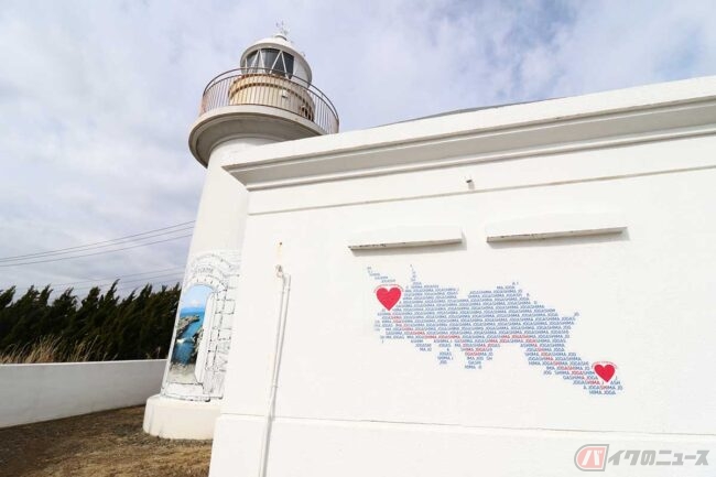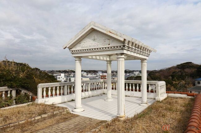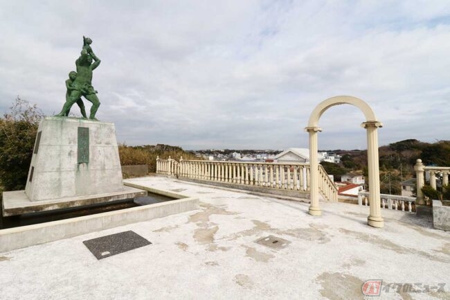 第3駐車場からのんびり歩いて10分もかからずに「城ヶ島燈台公園」に到着。階段を上がって行くと、なぜかギリシャ風の銅像や神殿のような展望スペースがあります。なぜギリシャ? と思いつつもう一段上がると「城ヶ島灯台」があります。ここは明治3年に建立された日本で5番目の洋式灯台で、現在も東京湾の航路を照らしているそうです。