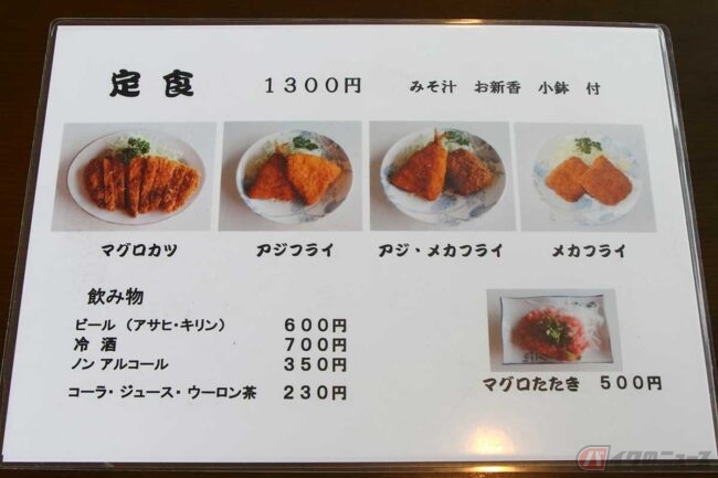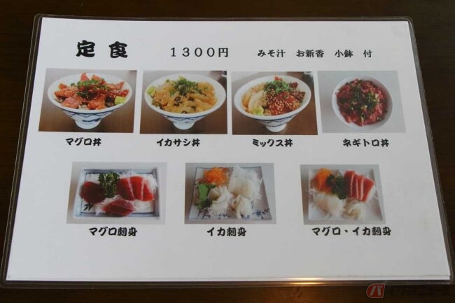 料理を待つ間に店主の加藤さんと話をすると、創業は昭和46年(1971年)で、以前はバス会社とのタイアップで観光バスが立ち寄るドライブインだったとか。店の収容人数も500人と大きかったそうです。潮風でアルミが腐食して窓が開かなくなったなど、建物の老朽化を機に閉店し、現在の小さな食堂にリニューアル。今でもお客さんの6割はその頃のリピーターだそうです。筆者も昔、ここで「マグロ丼」を食べたことがあります。三崎の対岸ということもあって、マグロが美味しかった記憶があります。