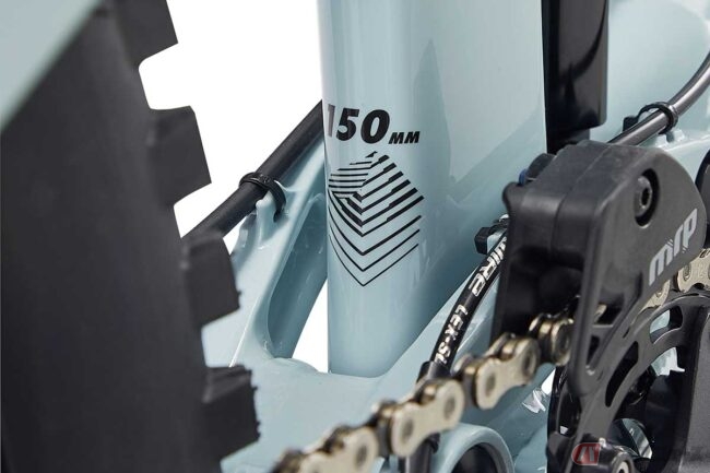 前後にサスペンションを搭載した「イントリーグLT」は、トレイルライドからエンデューロレースまでこなせるフロント160mm、リア150mmという、リヴのラインナップで最長となるストロークを確保し、女性向けにカスタマイズされています。