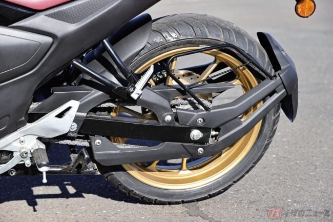 私が試乗したカラーは、『ブラック』です。ブラックのベースカラーに、シートのワインレッドとホイールのイエローゴールドが渋さを際立たせています。ネイキッドバイクのスポーティーさがありつつ、大人の落ち着いたカラーリングを両立しているように見えます。