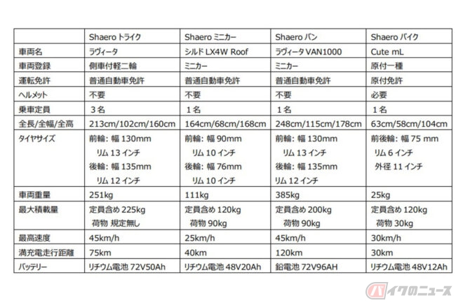 また、Shaeroミニカーと同じミニカーカテゴリの車両となるShaeroバンは、幅115cm、全長248cmのサイズで1,000Lの荷室を持つ配送用の小型EVで、最大積載量90kg、最高速度45km/h、満充電走行距離120kmとラストワンマイルの配送ニーズや、個人的な荷物の運搬のニーズに最適な車両となっています。