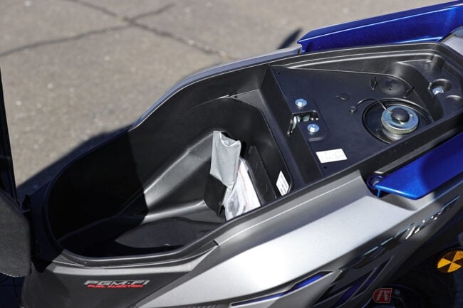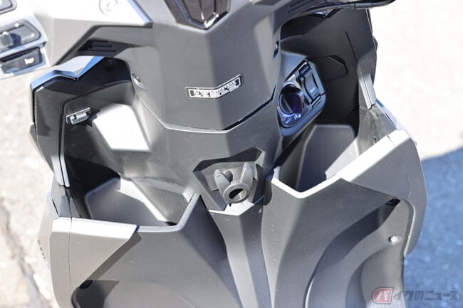 とはいえ個人的には、クルマと違ってバイクはむき出しな上に収納も少ないので、キーは鍵穴に挿すタイプの方が鍵を無くす心配も少ないので、バイクのスマートキーはオーバースペックに感じてしまいますが、インナーカウル左右に配置されたグローブボックスやUSB電源などと併せて、ハイテクで便利な1台となっています。
