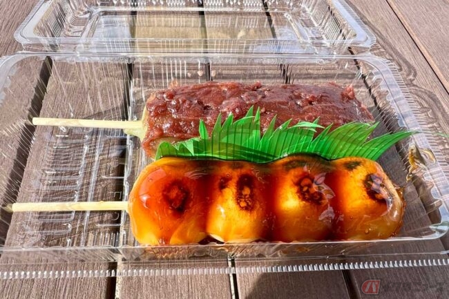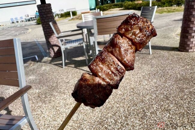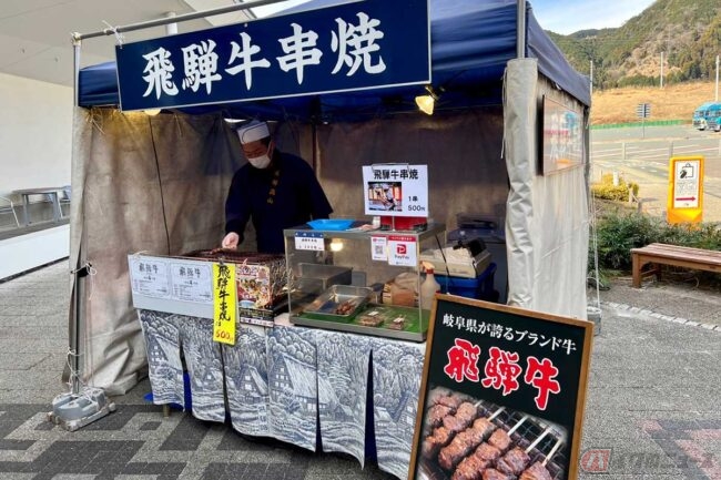 さすがにこれだけでは物足りないので、ほかの店でみたらし&あんの団子、さらに屋外の屋台で「飛騨牛串焼」(1本500円)もいただきました。岐阜県が誇るブランド牛は流石に美味いです。