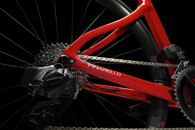 新型のピナレロXシリーズは、振動吸収性に優れたリア・トライアングル、同時に最大32mmの余裕があるタイヤクリアランスがポイントでしょう。シートステーはわずかにカーブしており、荒れた路面でも振動を吸収するT600カーボンファイバーの特殊なレイアップを最大限活用しています。