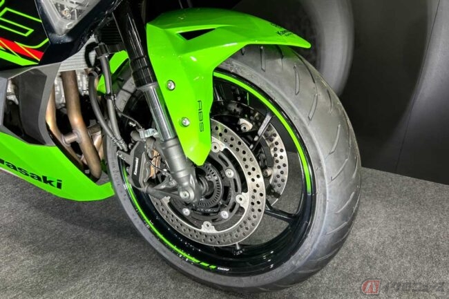 展示されたNinja ZX-4RRにおいては、フロントにプリロード調整機構付きショーワ製アドバンスドSFF-BPフォーク、リアにはNinjaシリーズのフラッグシップモデル「Ninja ZX-10R」と同じプログレッシブ特性を持つホリゾンタルバックリンク式リアサスペンションを搭載することで、スーパースポーツモデルらしい優れたハンドリングを実現しています。