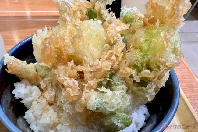 ここは天ぷら、そば、丼を提供する店で「深谷ねぎのかき揚げそば」(900円)や「大海老天丼」(1200円)などのメニューが並びます。ここで「深谷ねぎ丼かけそば」(1000円)というセットをオーダーしてみました。