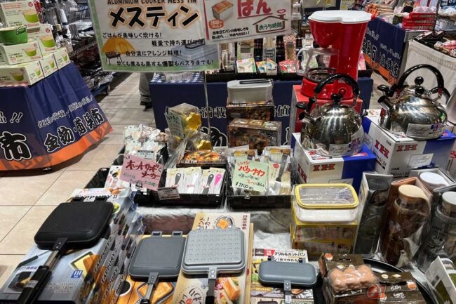 食後はショッピングを楽しむことができます。今回訪れたときは「金物道具市」が開催されていました。キャンプに使えそうなメスティンやホットサンドクッカーなども売られており、なかなか気になるコーナーでした。