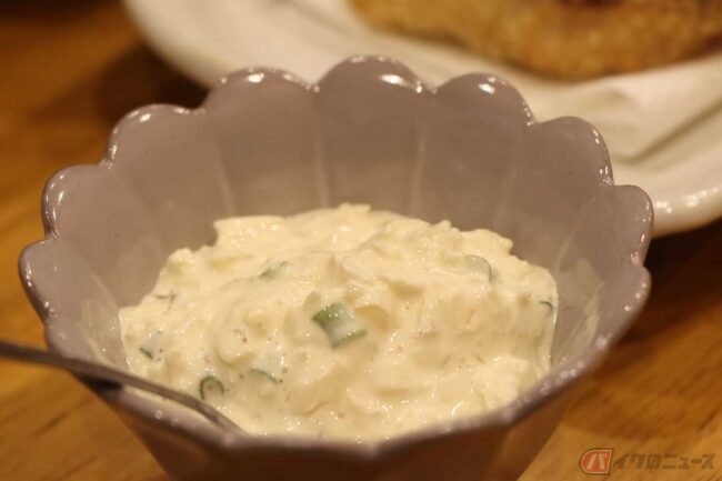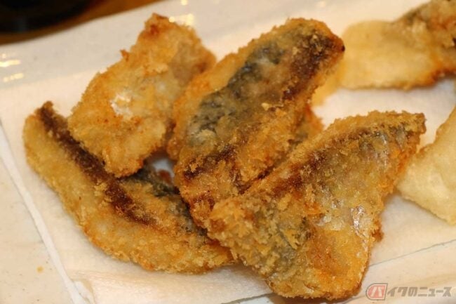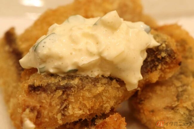 まずはアジフライからいただきます。低温で揚げているのでアジそのもののコクのある味が美味しいです。下味は付けていないそうなので素材の味が効いています。揚げ具合も良い感じです。お客さんに大好評の自家製タルタルソースを「たっぷり乗っけて食べて」ということでてんこ盛りでいただきます。これは合う! ご飯のおかずというよりビールの肴にしたい味です。