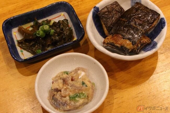 千葉さんこだわりの「アジの味噌タタキ」はなめろうよりも刺身感があって、これまた美味しい。同じものを具にしたみそ汁も絶品です。「めかぶ佃煮」もこれまた美味しくてご飯が何杯でもいけそうな味です。