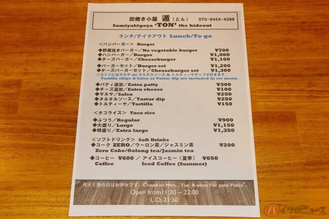 ということで、あっという間に完食してしまいました。「炭焼き小屋 遁(とん)」ではランチ営業もやっていますが、定食ではなくハンバーガーやタコライスなどを提供しているそうです。そしてそのハンバーガーも大好評だとか。アジフライと同じくらいハンバーガー好きの筆者としては、見逃せない話です。